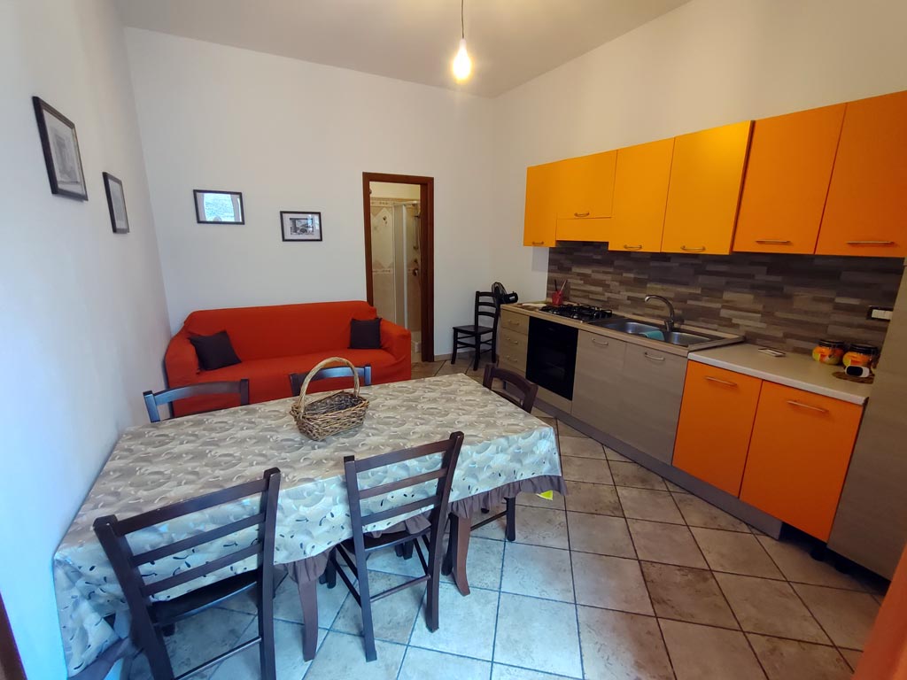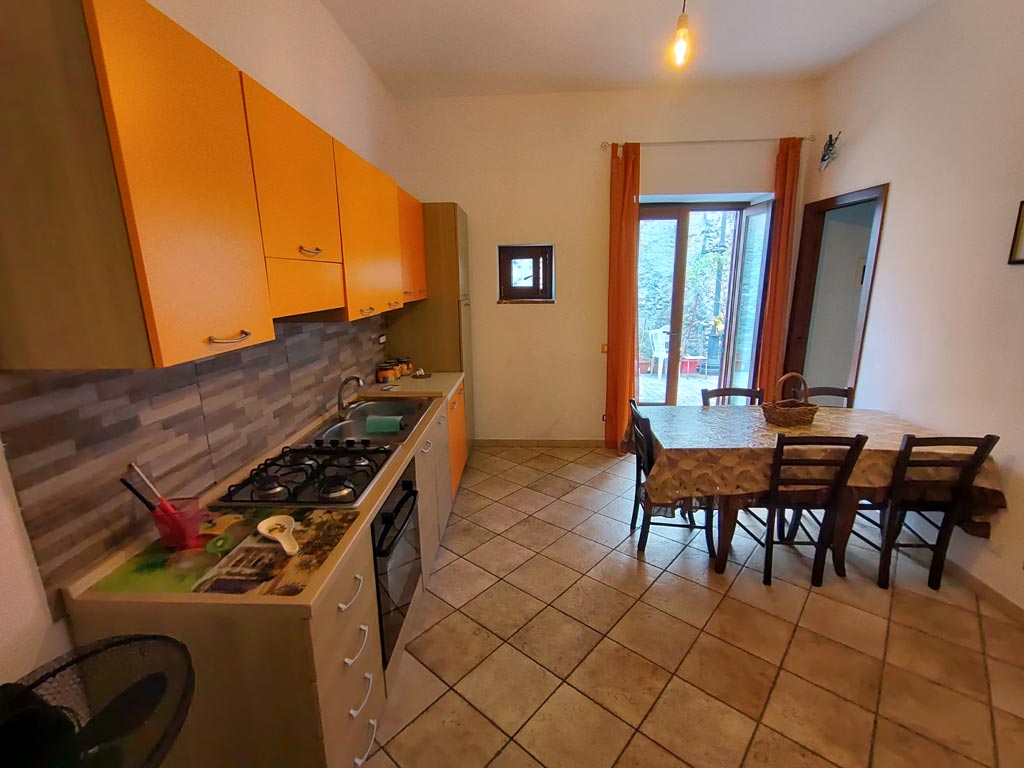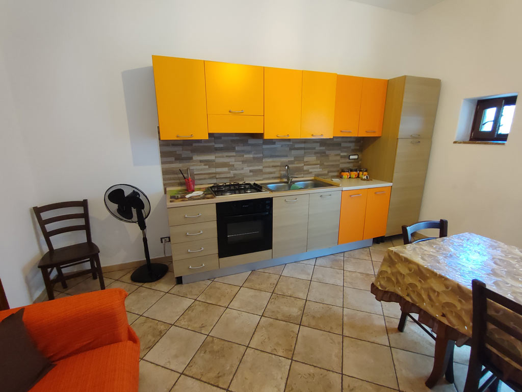 Al piano terra si accede direttamente alla cucina-soggiorno dove si trova un divano letto matrimoniale; la cucina a quattro fuochi è ben accessoriata ed ha anche il forno e la lavatrice. In questa zona c'è anche un bagno dotato di tutti i sanitari, con box doccia ed una piccola finestra.