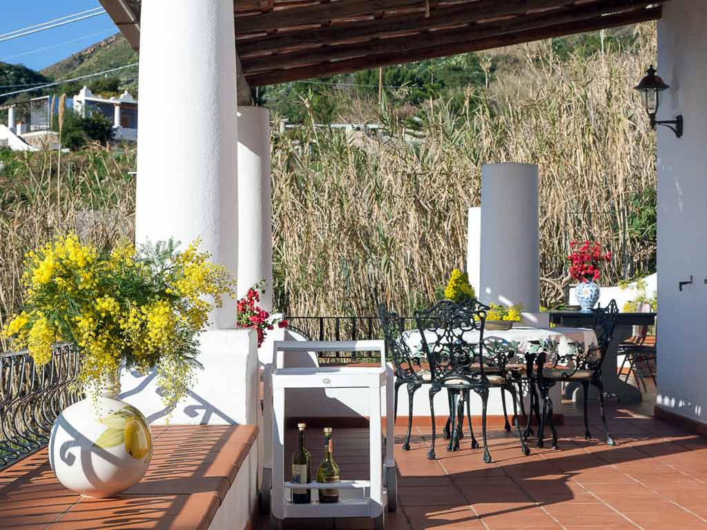 Al piano primo, davanti tutte le camere, che ne hanno quindi accesso diretto, c'è un bellissimo terrazzo panoramico coperto in tipico stile eoliano con le sedute chiamate bisuoli e i pilastri chiamati pulera. Da questo è possibile godere della vista del centro di Lipari e sullo sfondo dell'Isola di Vulcano e, con tempo limpido, anche con la vista dell'Etna sullo sfondo. Il terrazzo è attrezzato oltre che di tavoli e sedie anche con salottini in vimini e sdraio. Il tutto per godere del relax che solo una zona del genere può regalare.