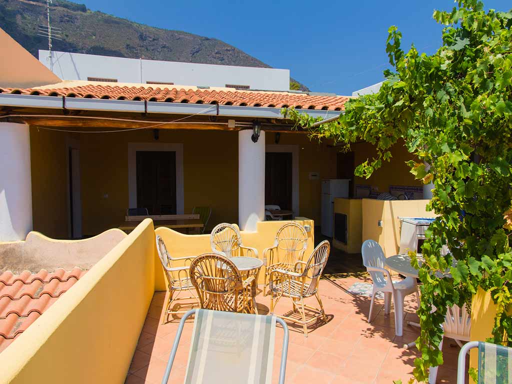 The large terrace partly covered and partly open and furnished with table and chairs. From the terrace you can enjoy a partial view of the sea and the island of Lipari. On the terrace there is also a second kitchen, complete with all the amenities and oven.