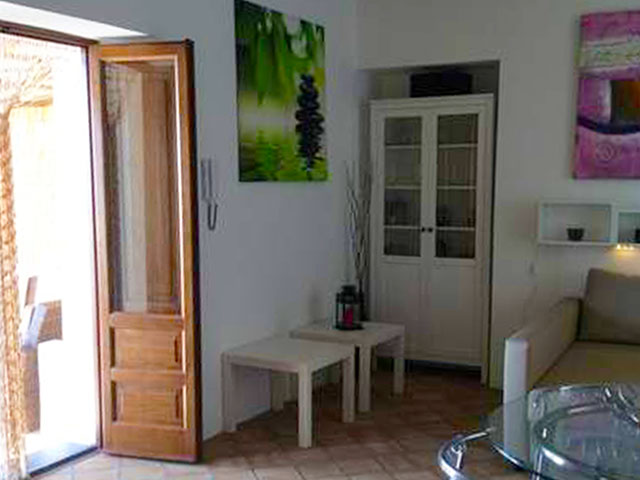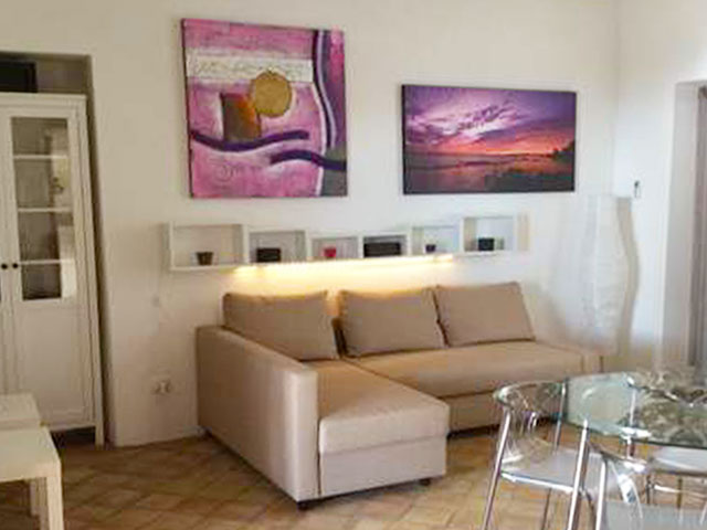 - si accede dal piano terra in un grande living con 2 divani letto matrimoniali che possono ospitare sino a 4 persone. Cucina interna attrezzata. Le camere sono due: una con letto matrimoniale ed una con lettino a castello per un totale di 8 posti letto.
