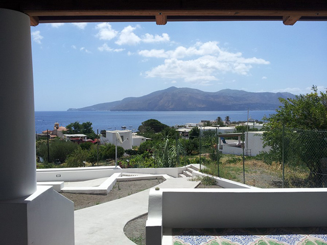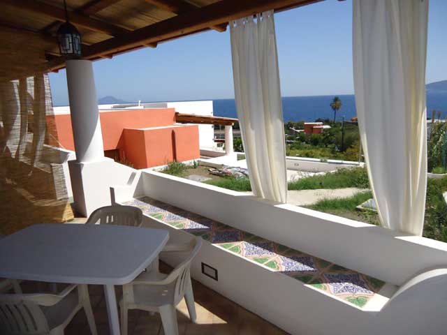 The covered terrace, which leads to the apartment, has a panoramic view on the island of Lipari and is equipped with outdoor table and chairs.