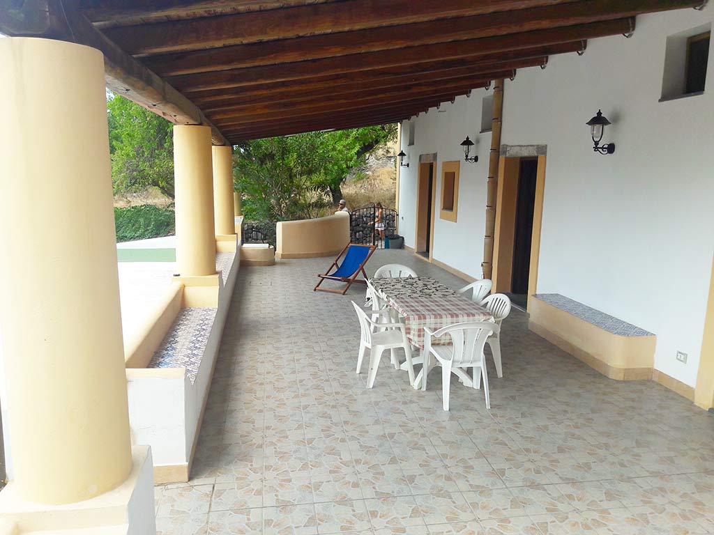 La villetta ha ingresso da un ampio terrazzo coperto attrezzato in stile eoliano, con tavolo, sedie e sdraio. Dal terrazzo è possibile godere di una vista mare parziale con lo sfondo delle isole di Lipari e Vulcano.