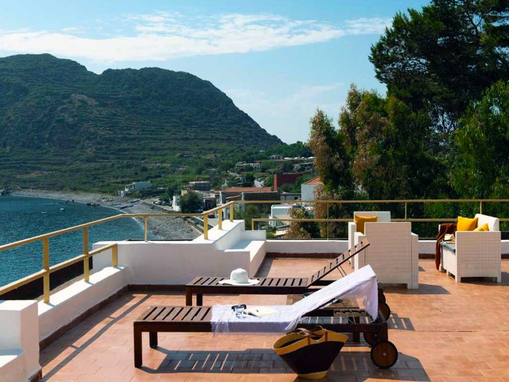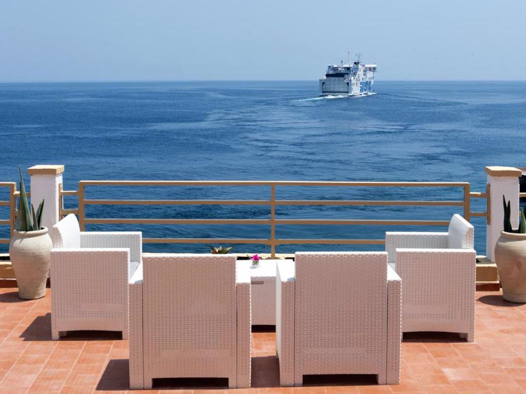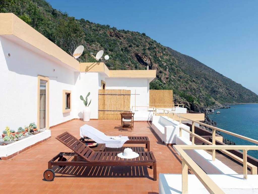 The large windows overlook the gorgeous panoramic terrace where you can enjoy the wonderful landscape that encompasses Stromboli and Capo Graziano.