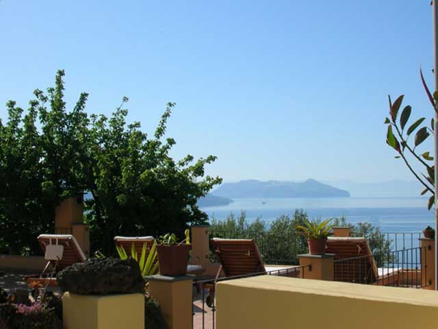 VILLA EOLO: Junior suite with two rooms, a bedroom and a living area complete with sofa bed, large kitchen with oven and fridge, and a large terrace with a panoramic view of the sea characterized by the particular stone seats, called "bisola" . The interior gives guests the chance to enjoy authentic wooden sculptures made specifically for the residence, independent air conditioning, garden full of plants, private barbecue and outdoor shower