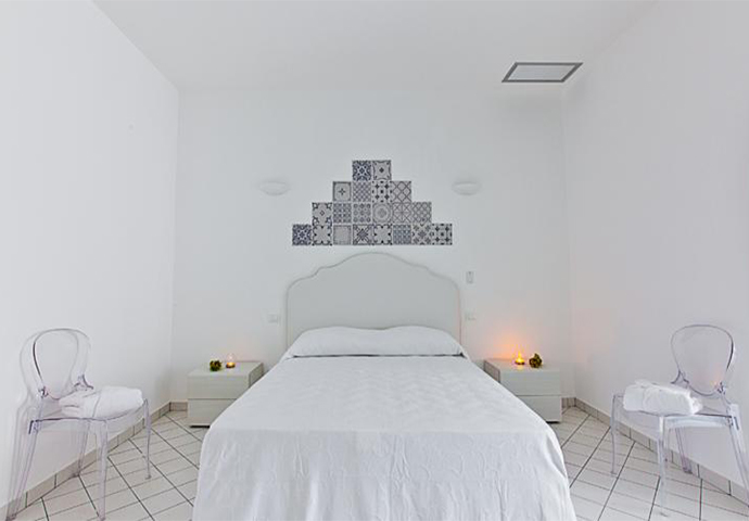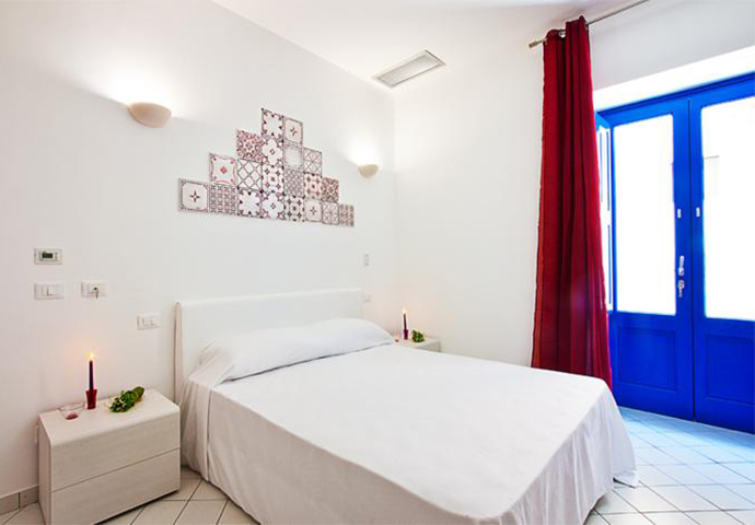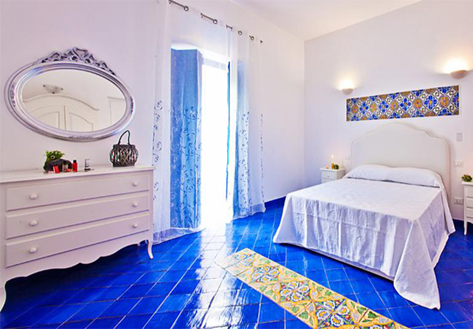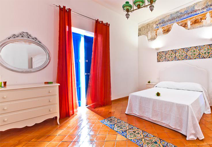 - Rif. SA: camera di 25 metri quadri da 2/3 posti letto con soggiorno. Decorata da preziosi affreschi conservati nella loro originilità e impreziosita da ceramiche napoletane ottocentesche Raffaele Prete. La camera si affaccia sul giardino interno e gode di un terrazzo maiolicato.