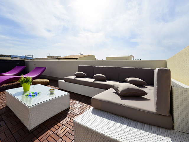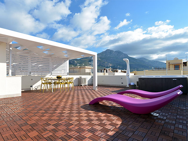 Ha posto auto privato, terrazza solarium ad uso esclusivo attrezzata con salottino, sdraio a dondolo e vasca idromassaggio SPA riscaldata, Wi-Fi flat.