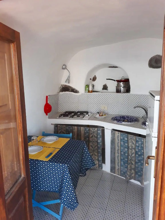 The kitchen area, finely decorated in perfect Aeolian style, equipped with a four-burner hob and sink, refrigerator, table and chairs, is equipped with dishes and everything you need to cook at home.