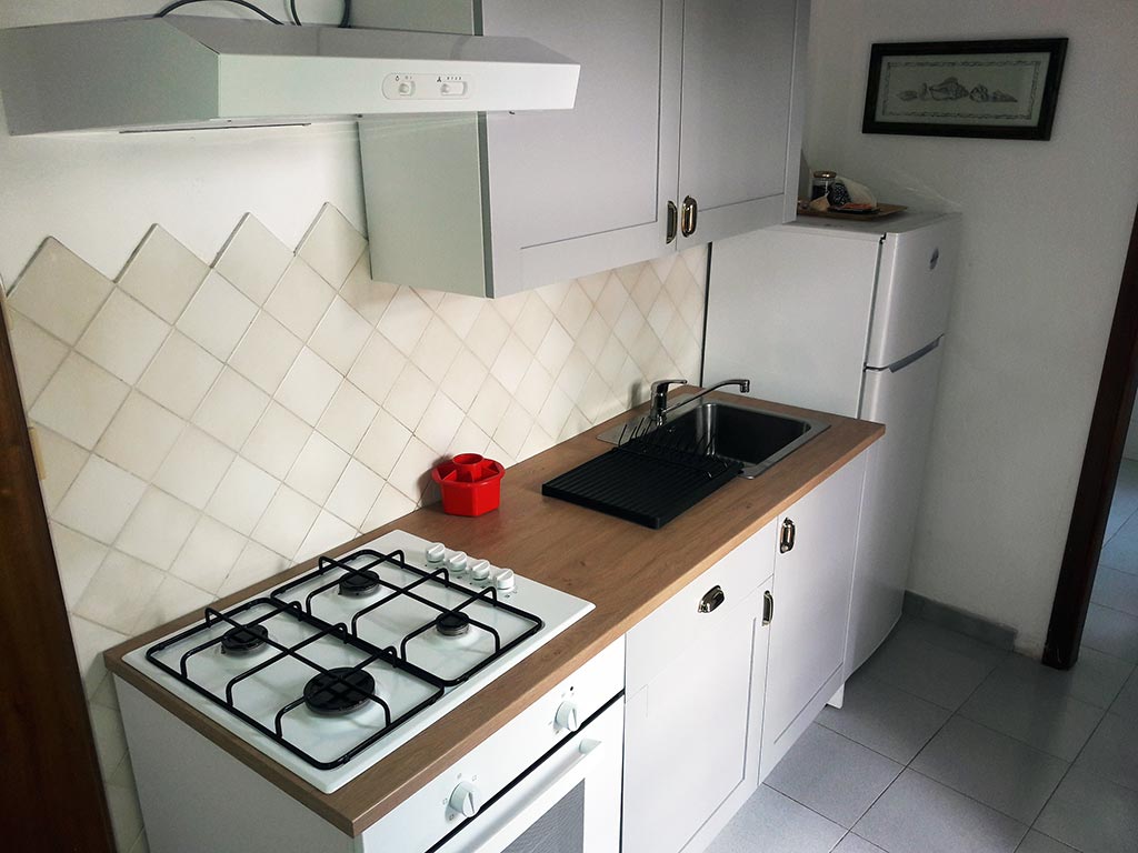 Separata da una porta si trova la zona cucina completa di forno, e che funge anche da zona di ingresso.