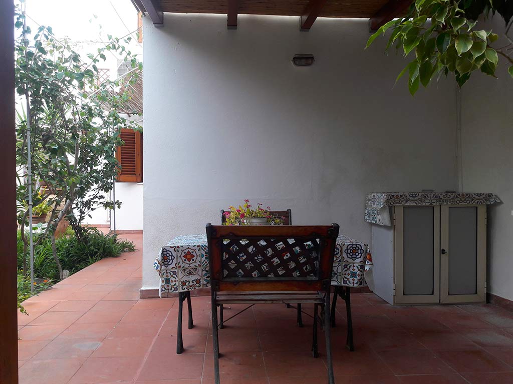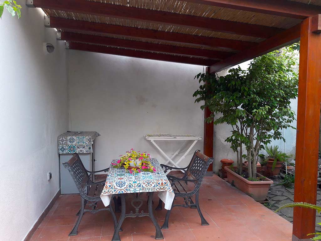All'esterno si trova un piccolo terrazzino coperto dotato di tavolo e sedie in ferro battuto.