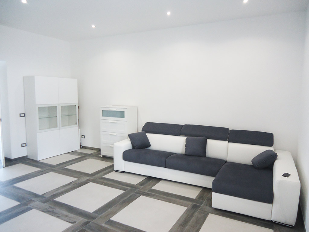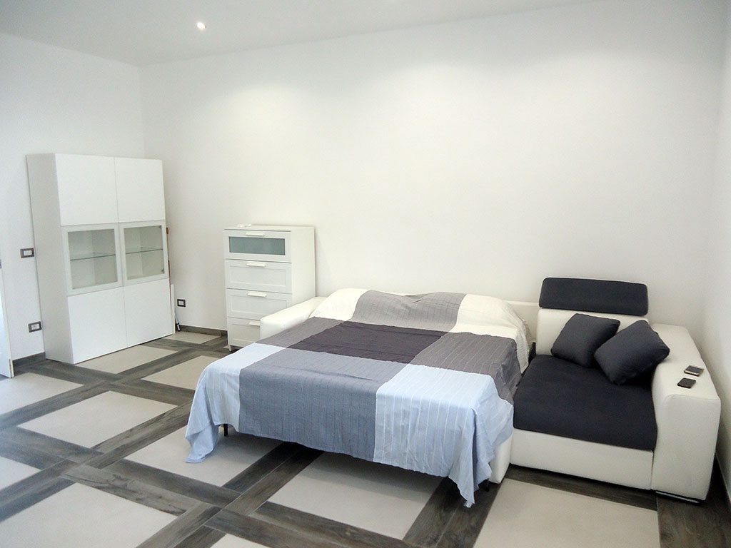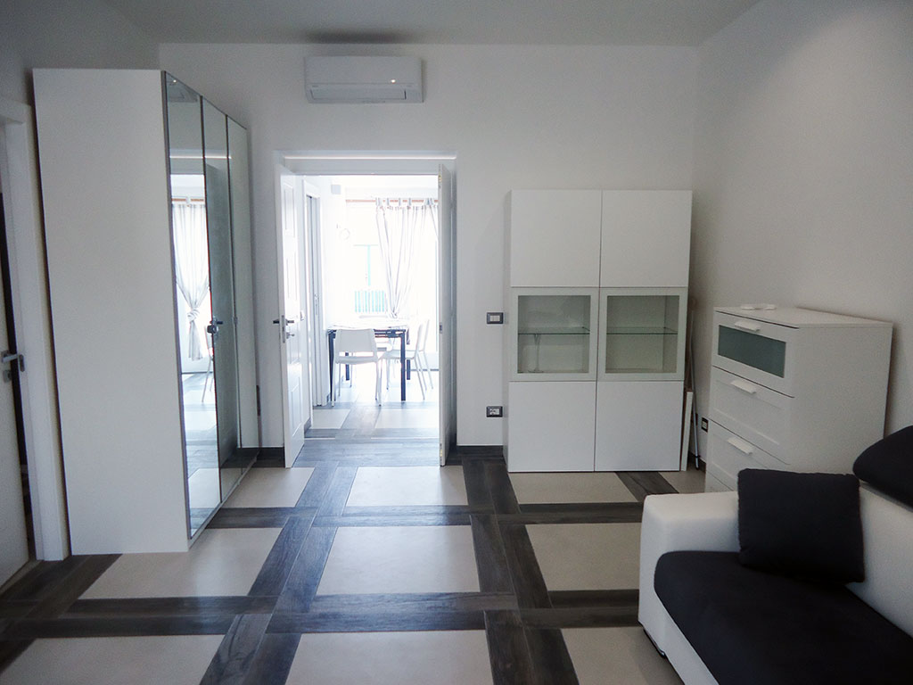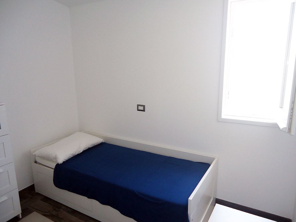From the living area there is access to the equipped kitchen with 4 burnes, oven, dishwasher, fridge and air conditioning ; from the kitchen there is access to a second bedroom with two single beds, wardrobe, desk, window and air conditioning.