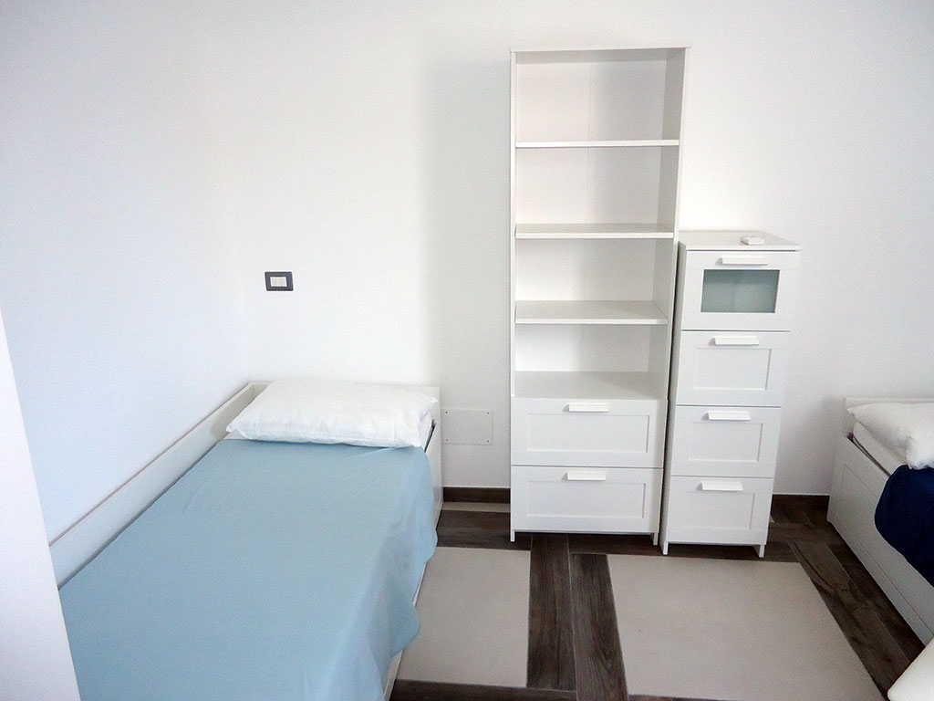 Dalla cucina si accede invece ad una seconda camera con due letti singoli, armadio, scrivania, finestra ed aria condizionata. I letti hanno cassetto apribile che li trasforma in letto matrimoniale.