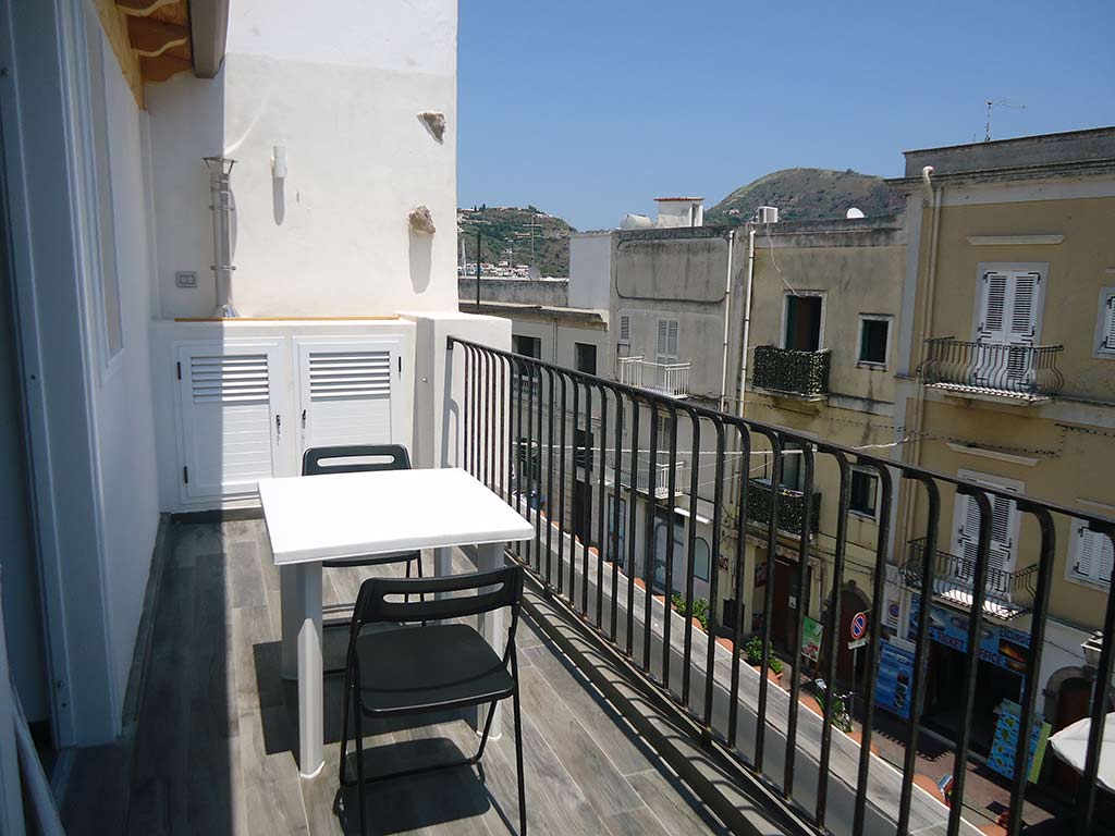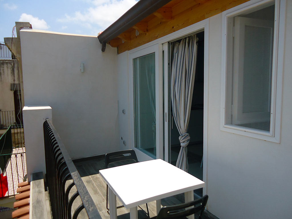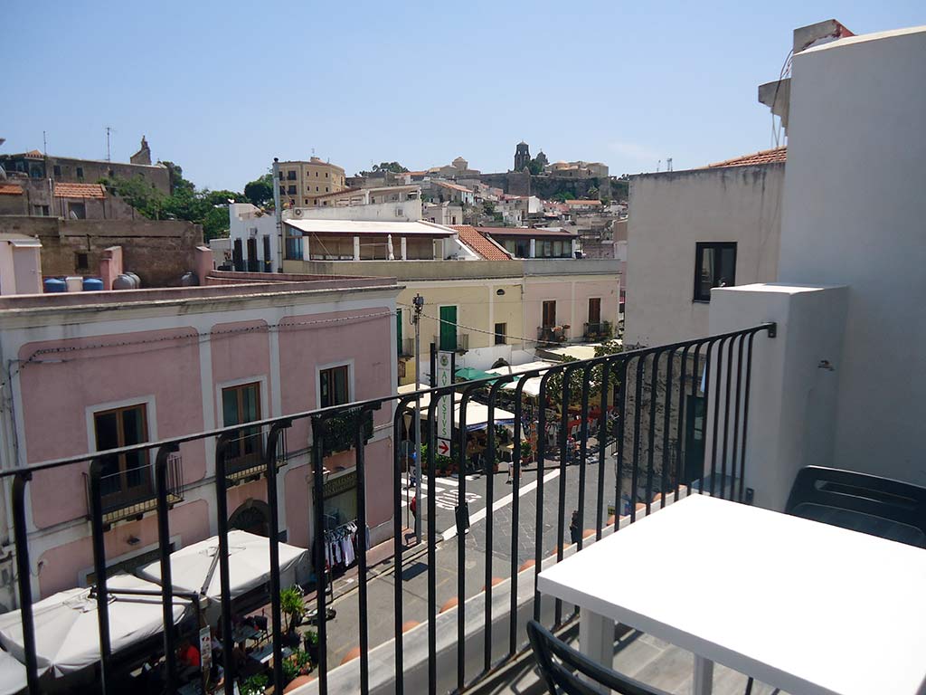 Sempre dalla cucina si esce nel terrazzino che è attrezzato con tavolo e sedie e ha una bella vista sul castello di Lipari.