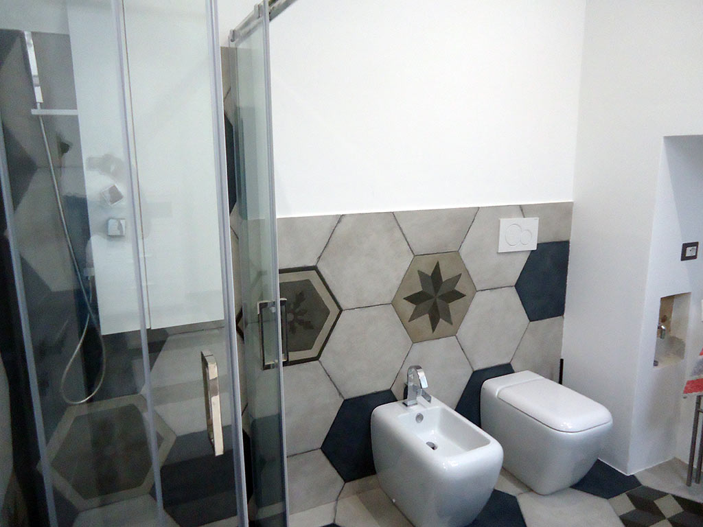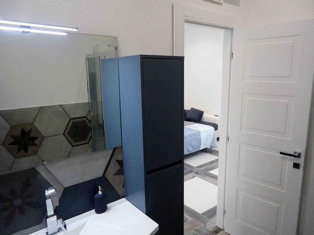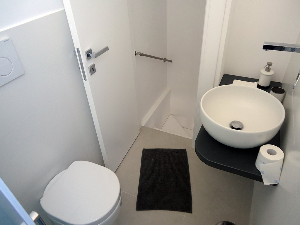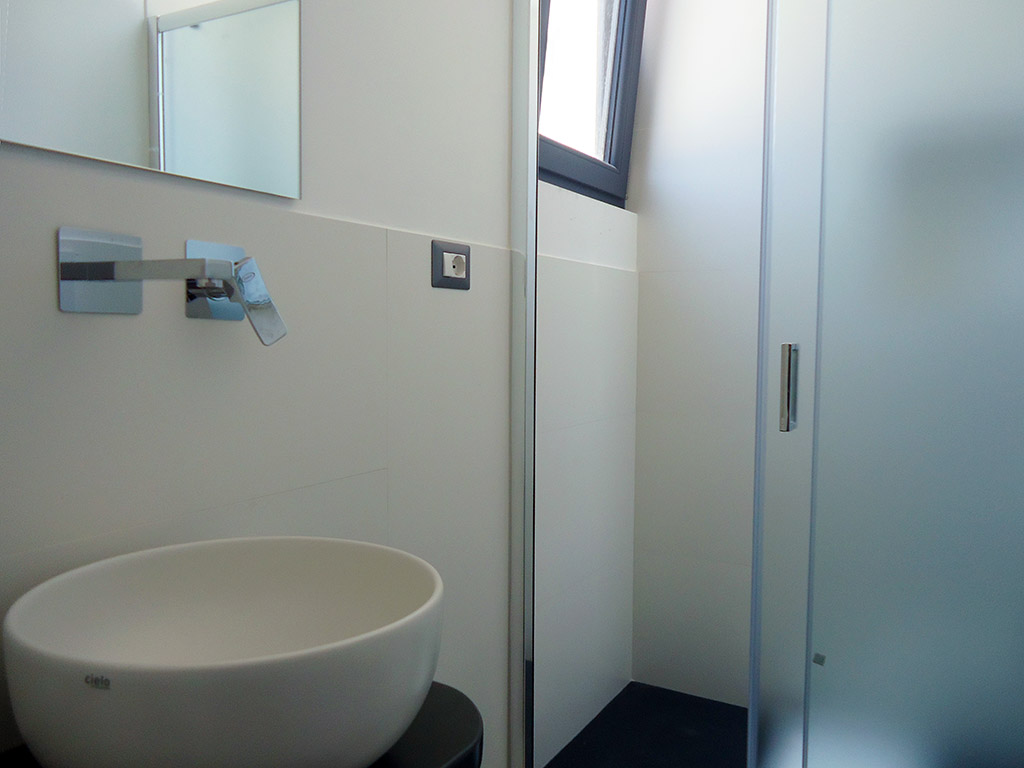 Da questa stanza c'è accesso al primo bagno completo di tutti i sanitari, ampio con box doccia e finestra luce sul tetto. L'accesso al secondo bagno avviene tramite una scala che porta a un piccolo soppalco. Qui si trova un ampio box doccia e una grande finestra. In questo bagno non c'è bidet.