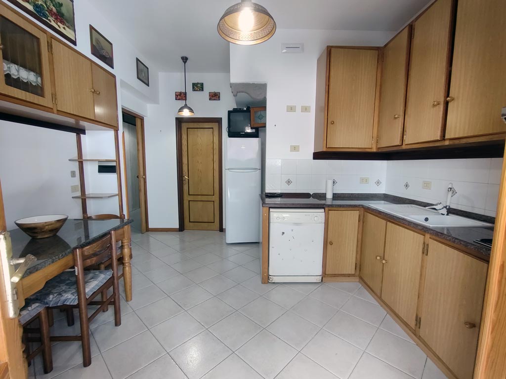 Dal terrazzo si entra direttamente nella cucina pranzo attrezzata con piano cottura a 5 fuochi, frigo, TV, tavolo e sedie.