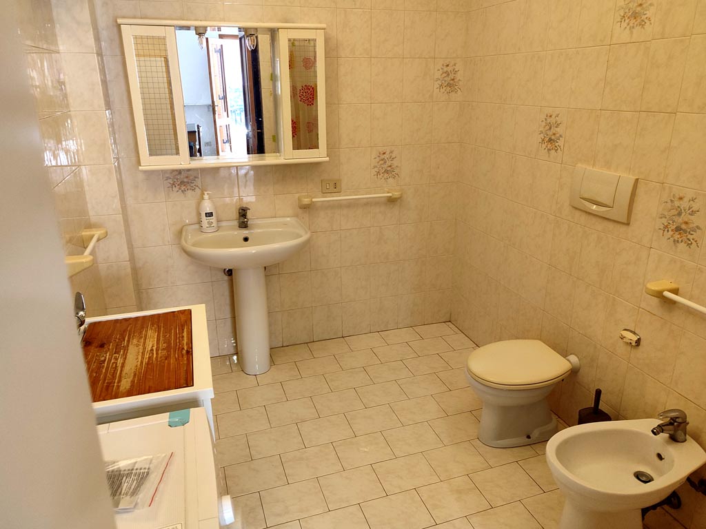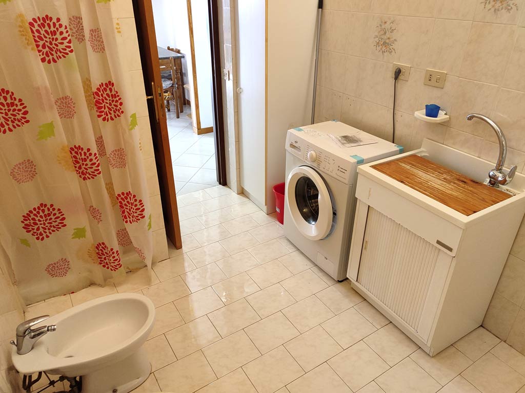 Dalla zona pranzo si accede all'ampio bagno dotato di tutti i sanitari con doccia in muratura con tenda e finestra alta. Sempre nel bagno c'è un comodo lavatoio ed anche la lavatrice.