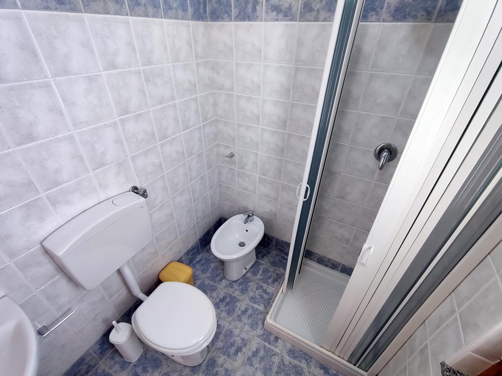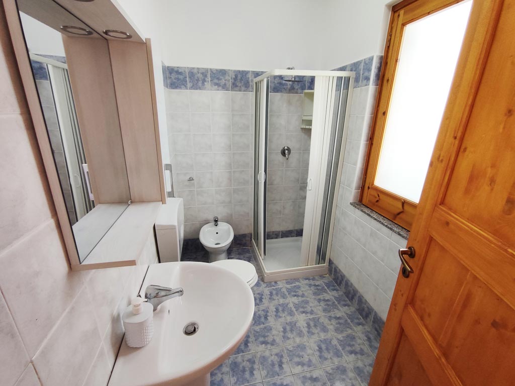 Il bagno è completo di tutti i sanitari e con box doccia e finestra