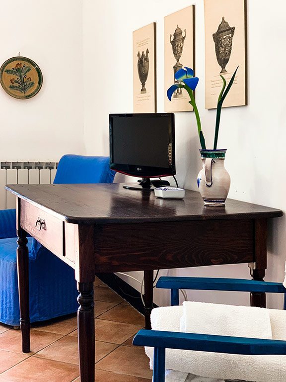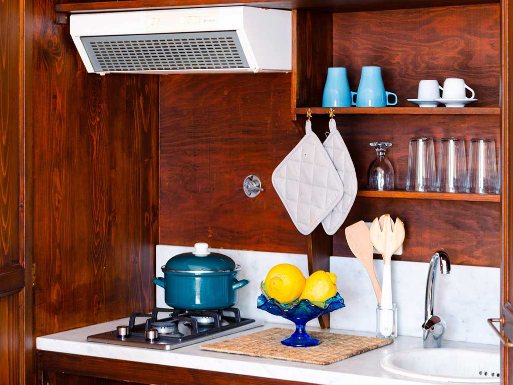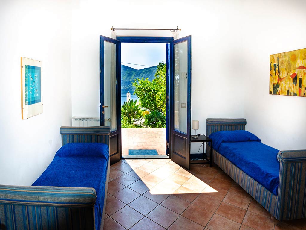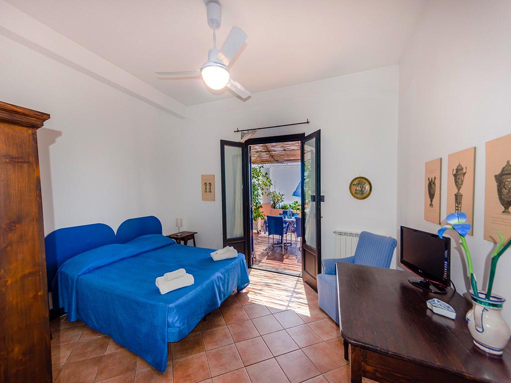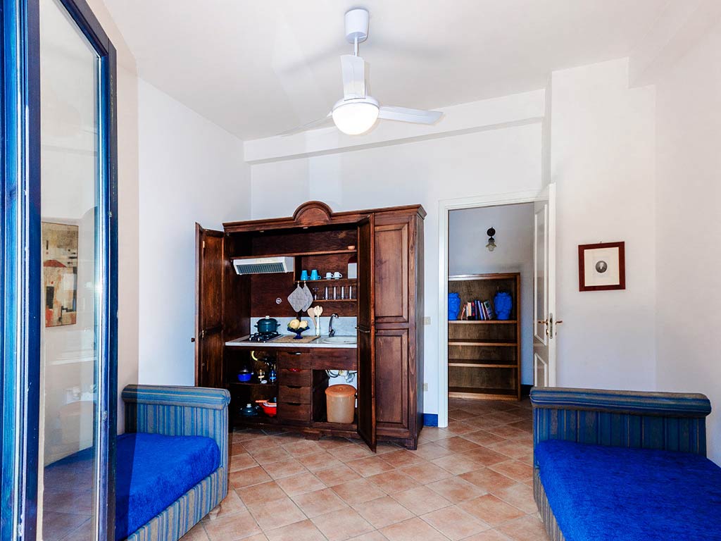 Flat B: is an apartment on the average level of the villa and has a matrimonial bedroom with a door-shutter overlooking the terrace and a living room with two sofa-beds and hideaway kitchenette with 2 burners.