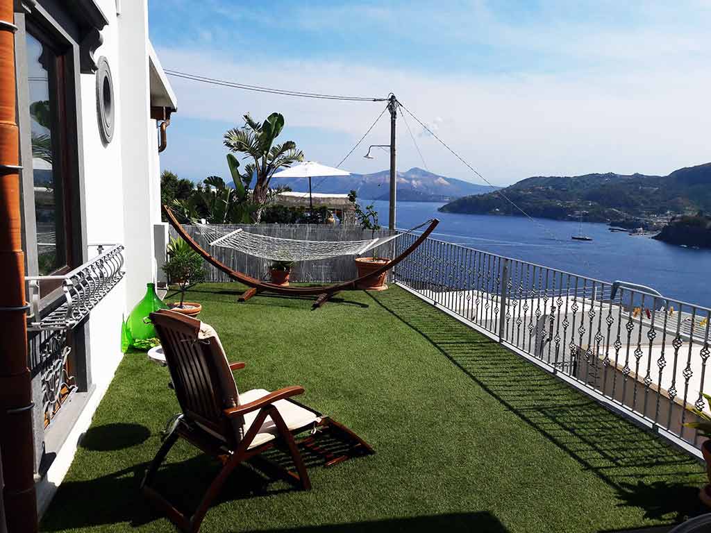 From this room you go in the covered terrace overlooking the bay of Lipari, with table and chairs.