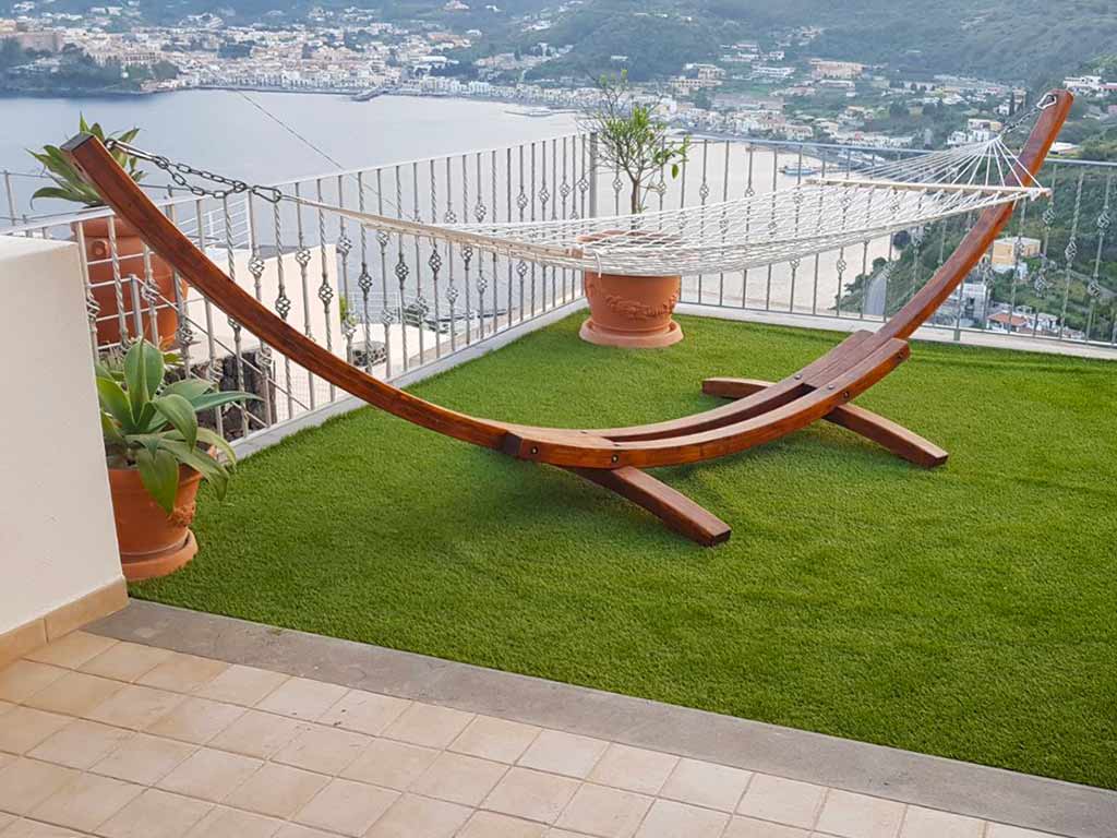 La parte scoperta del terrazzo è stata attrezzata di amaca, panchina e sdraio su di un tappeto verde sintetico ricavando così un'ampia Zona Relax.
