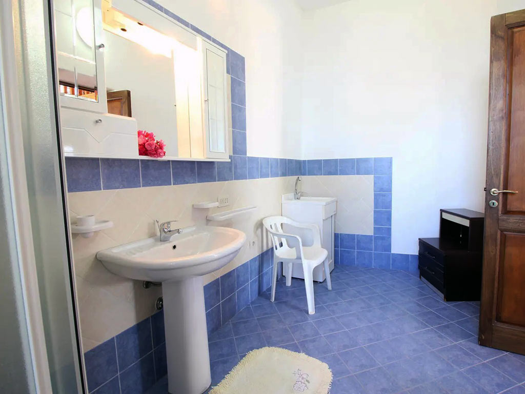 Il bagno completo ha box doccia, lavatoio e lavatrice.