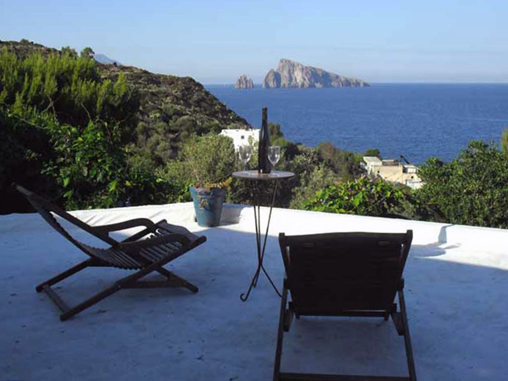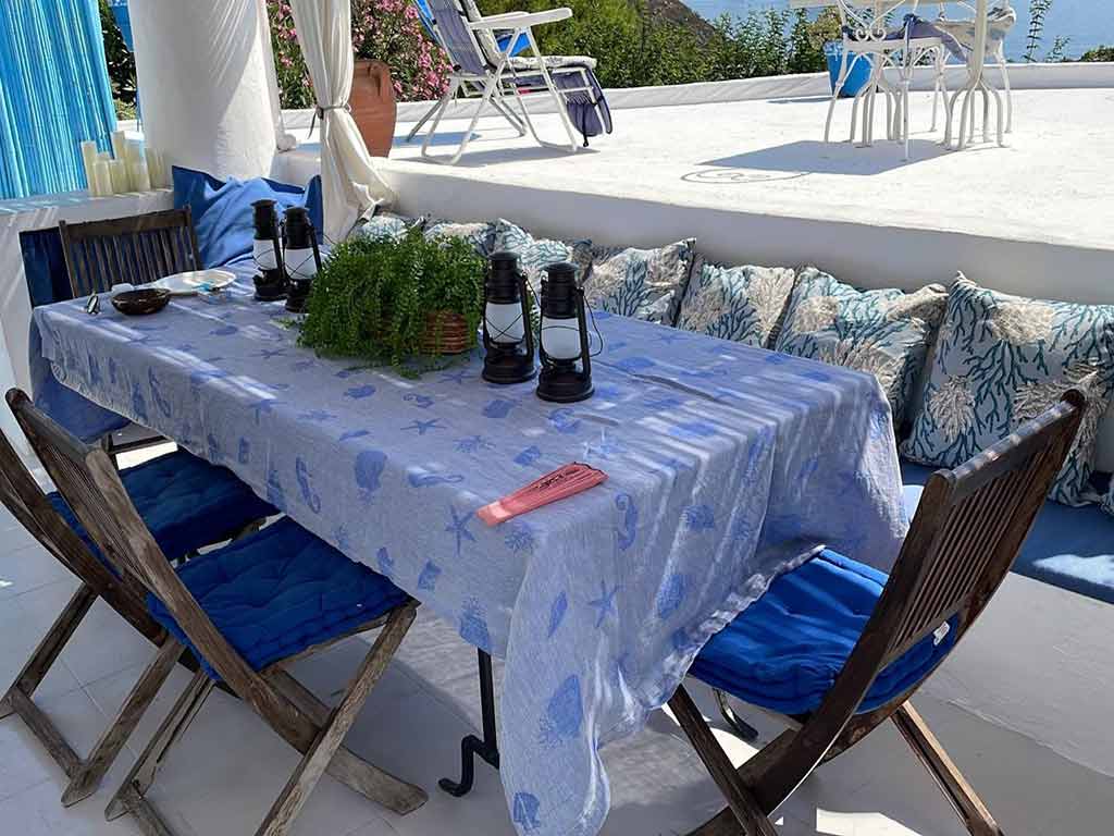 The terrace is covered in the typical Aeolian style, is furnished with table and chairs. It has sea views and the small islands.