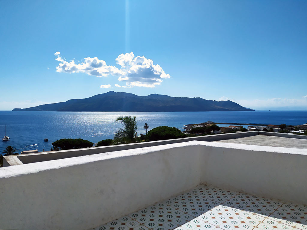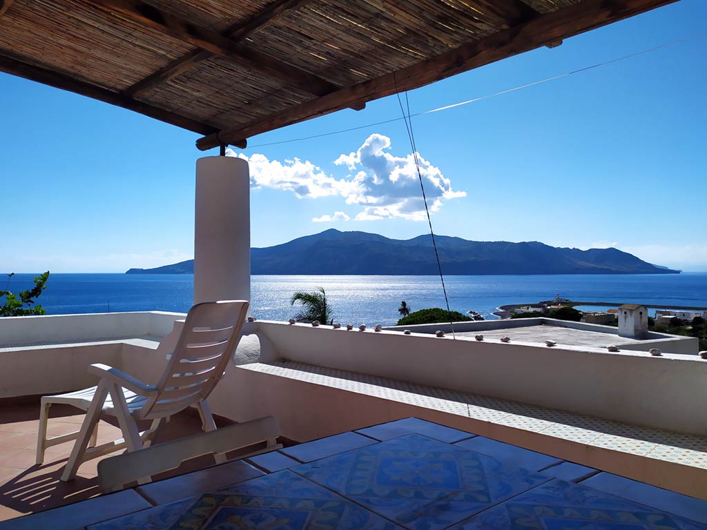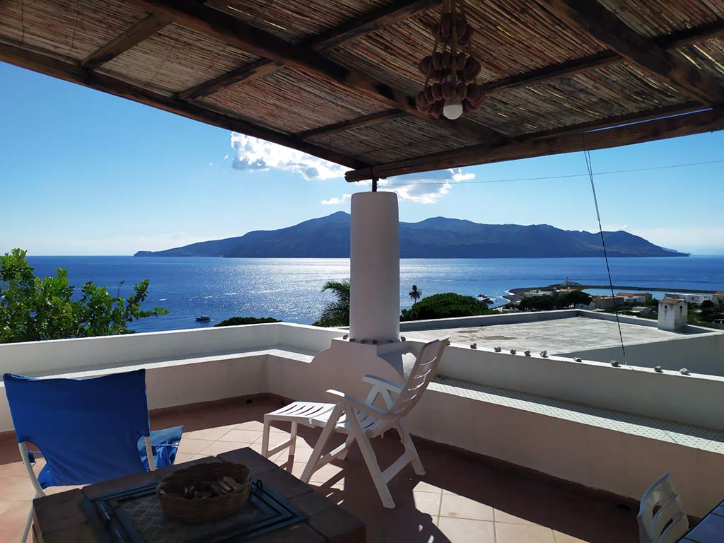 Il grande terrazzo è attrezzato di tavolo e sedie ed ha uno splendido panorama con vista sul caratteristico laghetto salato del borgo di Lingua e sulle isole di Stromboli, Panarea e Lipari.