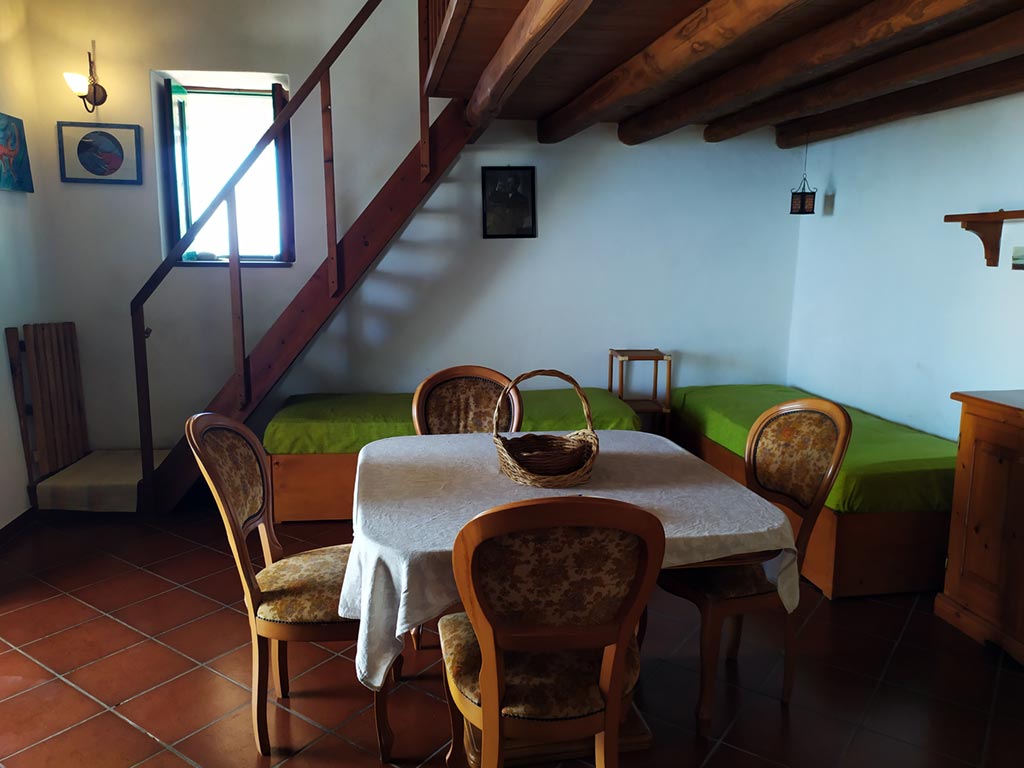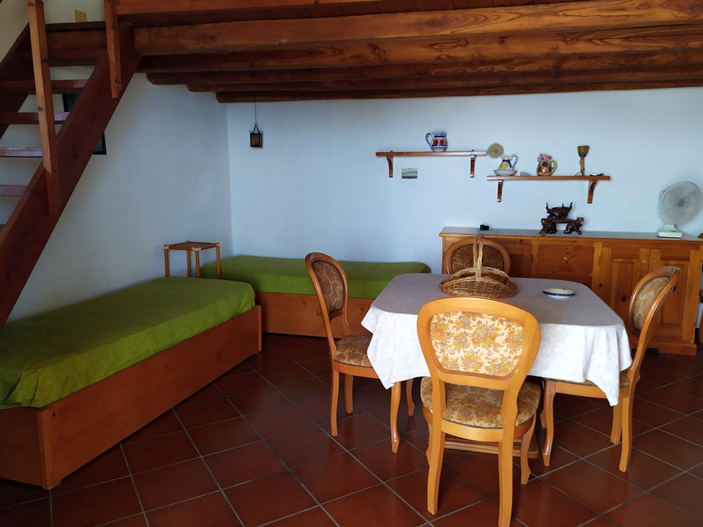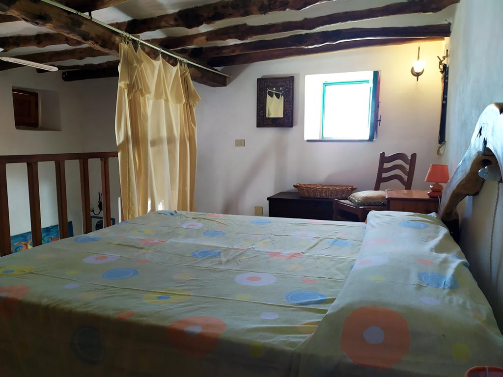 La casa è composta da soggiorno con 2 letti singoli (anche unibili), zona soppalcata con tenda separè ove vi sono un letto matrimoniale e una piccola finestra.