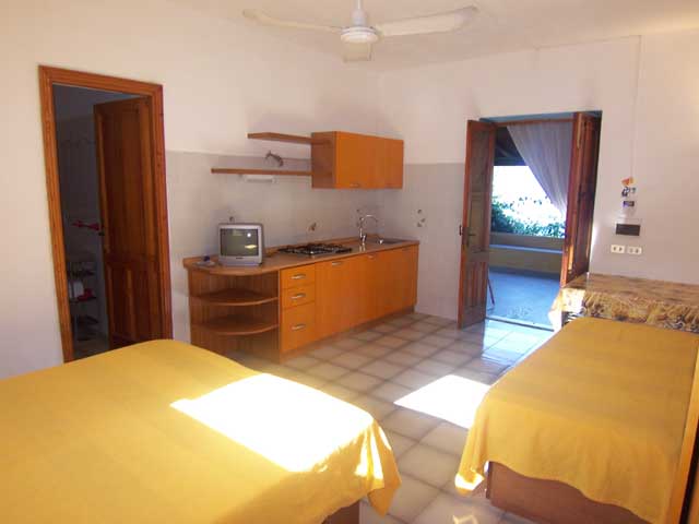 > Orange House (beds 2+1)= it is a studio apartment with matrimonial bed (or 2 single beds ), single divan-bed and kitchen zone in wood. The place is endowed with fan to ceiling. The toilet is complete of shower and window.