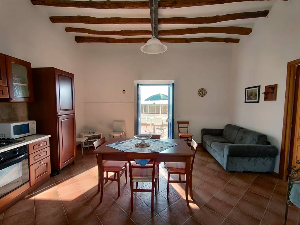 Casa con accesso sull’ampia cucina soggiorno con divano letto matrimoniale più terzo letto singolo. L'angolo cottura ha 4 fuochi, frigo e forno elettrico.