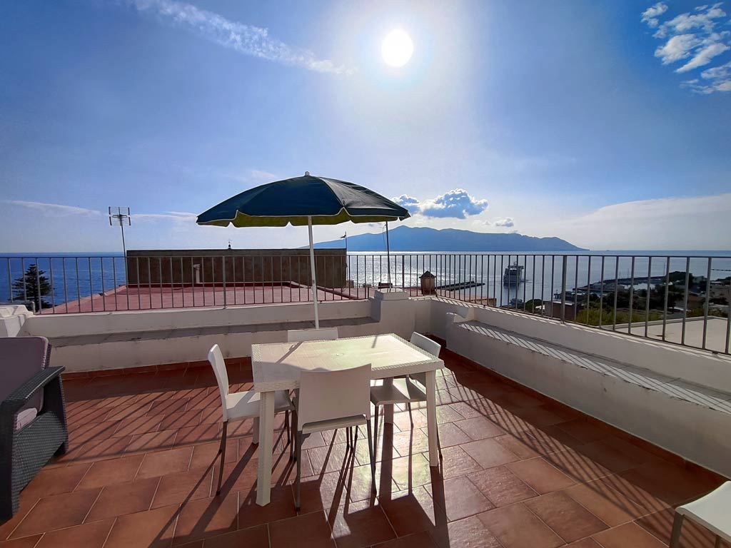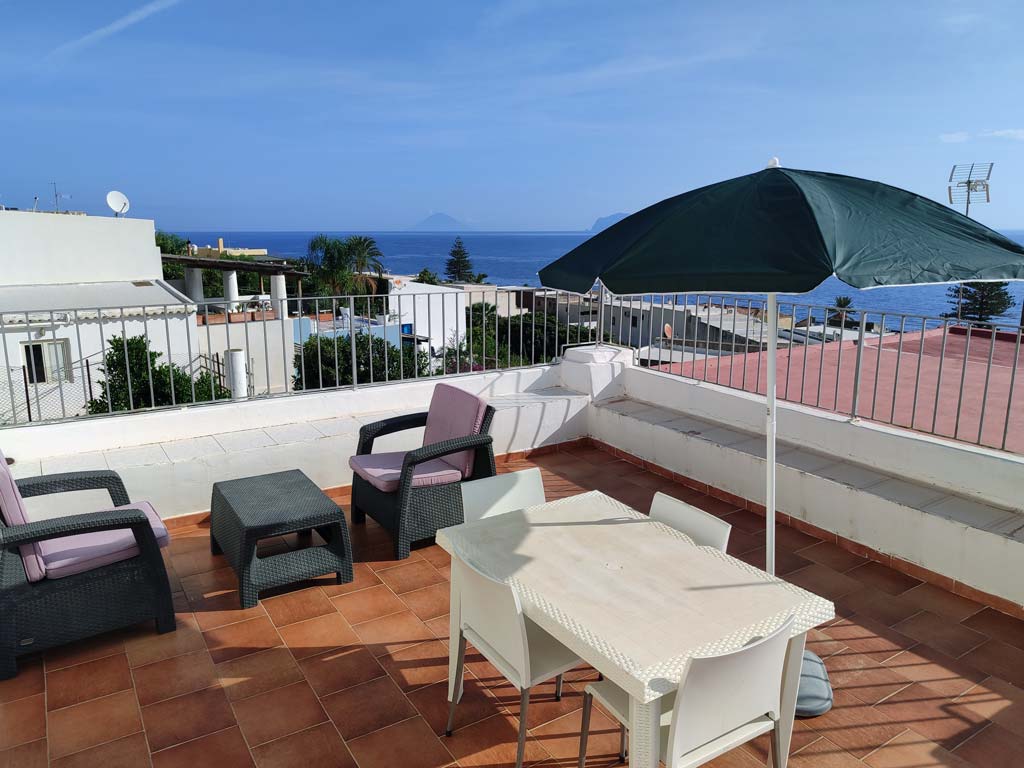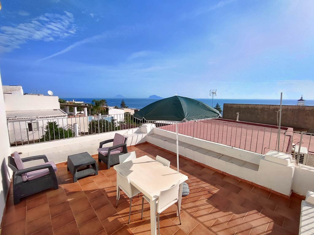 Il terrazzo è attrezzato con tavolo e sedie, divanetti in Rattan ed ombrellone. Ha una splendida vista sul mare e sulle isole di Lipari, Panarea e Stromboli.