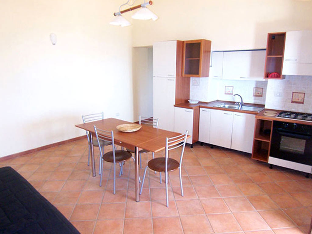 Nel secondo vi è la cucina soggiorno attrezzata di tavolo con sedie, frigo, piano a 4 fuochi ed anche di forno. Anche questo ambiente è dotato di Aria Condizionata ed inoltre di un divano letto matrimoniale.