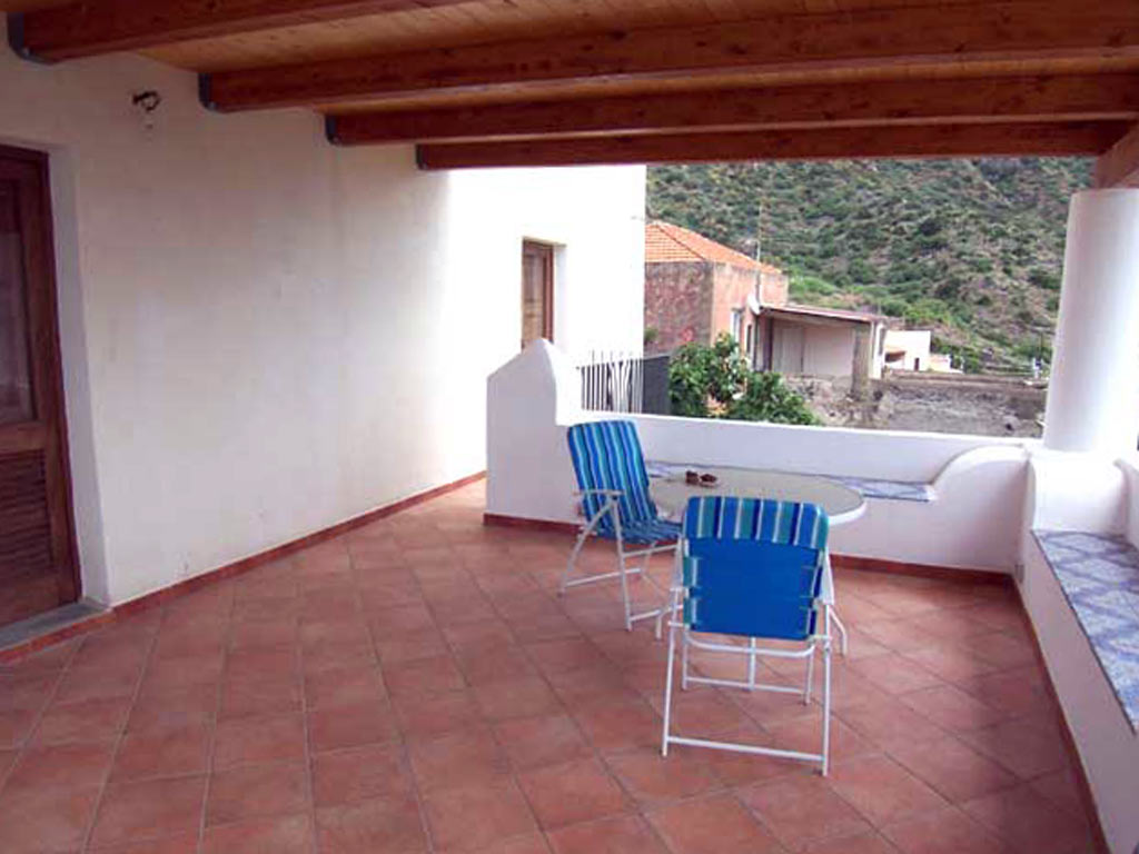All'esterno vi è ampio terrazzo coperto panoramico attrezzato con tavolo e sedie e con vista panoramica, oltre che sulla baia di Rinella, anche sulle isole di Lipari e Vulcano. Nel terrazzo vi è angolo attrezzato con con lavatrice.
