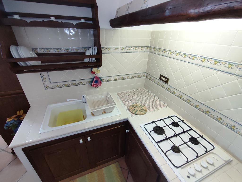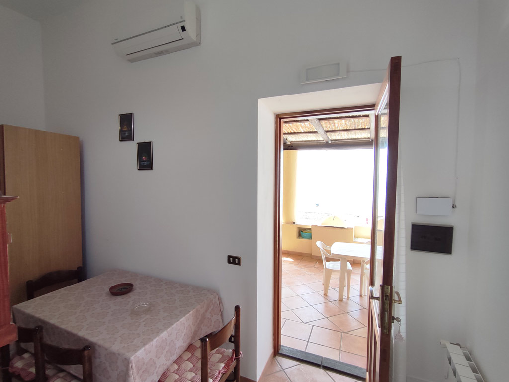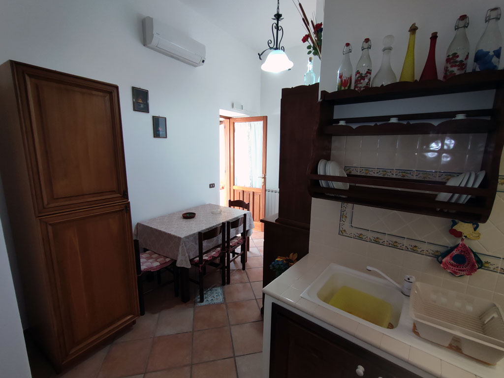 Separata tramite una porta si trova la zona cucina pranzo attrezzata con angolo cottura in muratura, tavolo con sedie, frigo ed Aria Condizionata. Anche la zona cucina pranzo ha uscita diretta sul terrazzo.