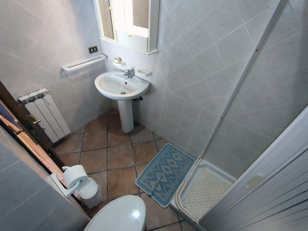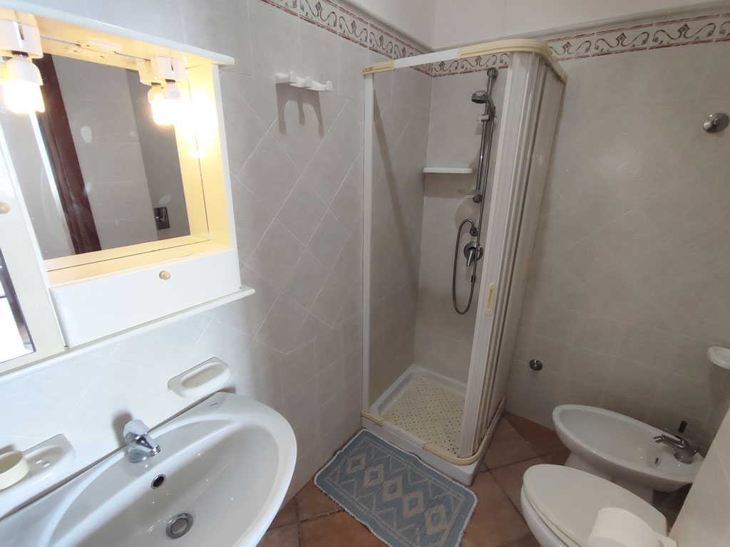 Il bagno è completo di tutti i sanitari ed ha box doccia ed aspiratore.