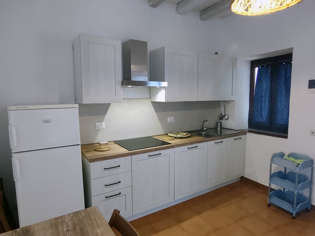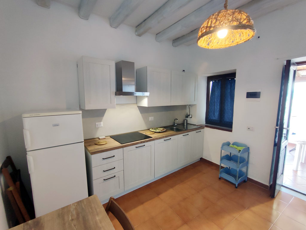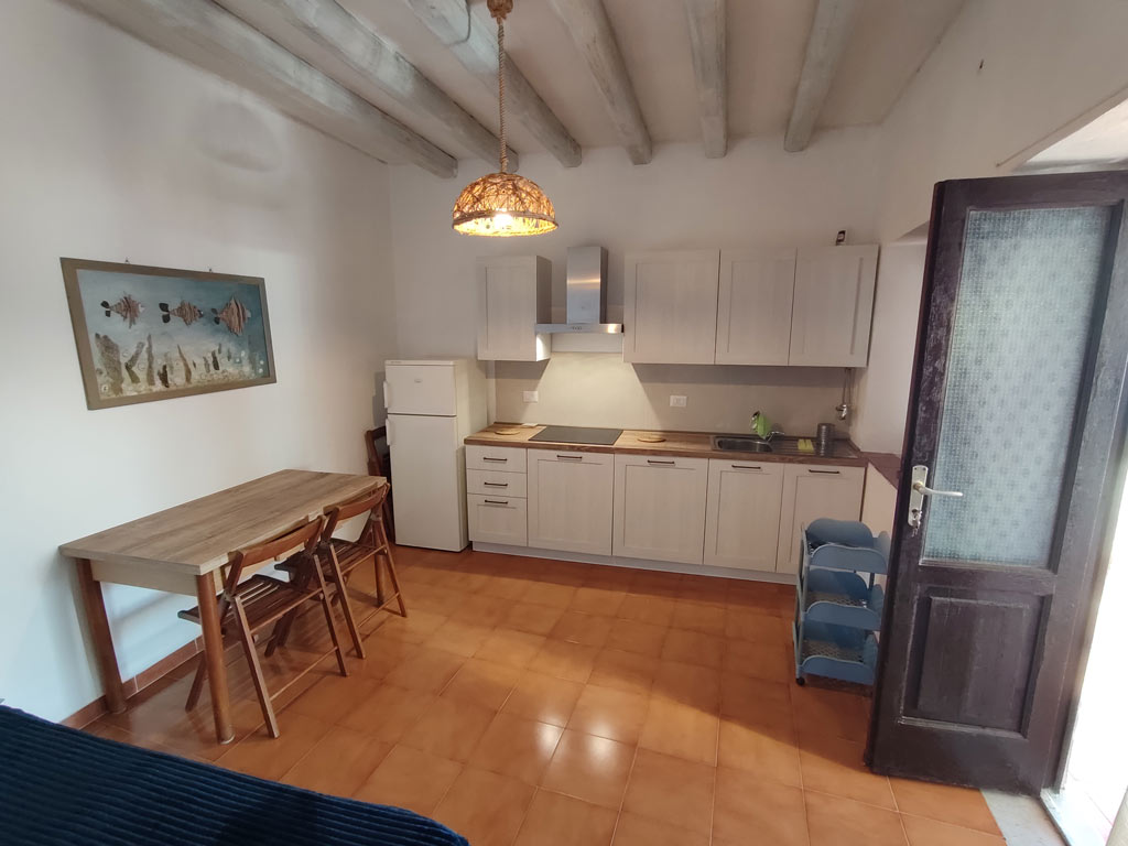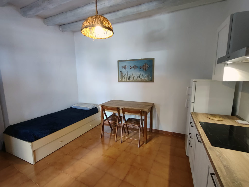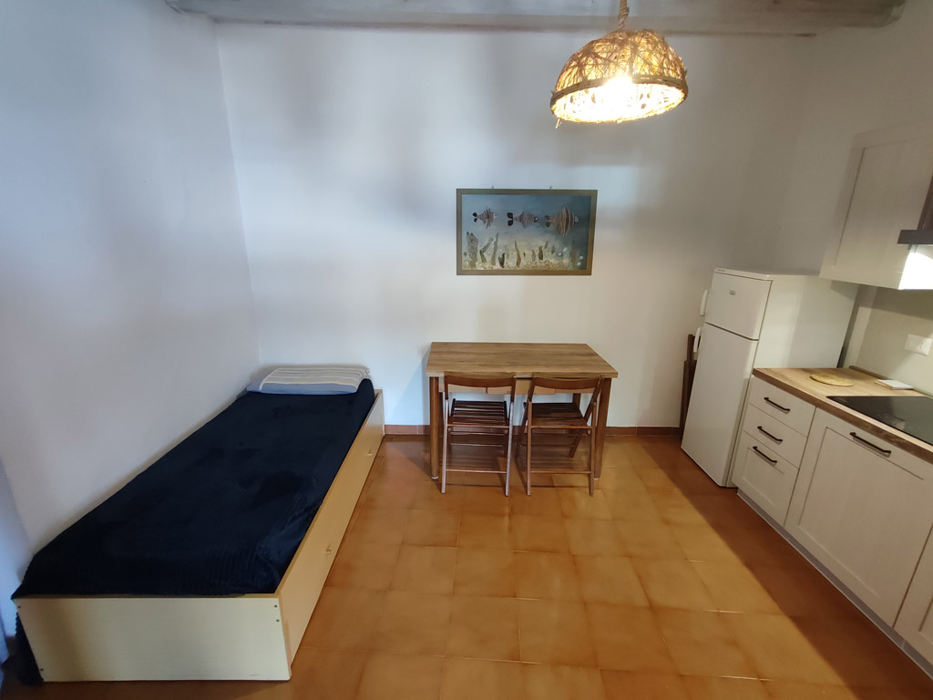 Bilocale al piano primo della struttura composto da un primo ambiente con angolo cottura ad induzione, tavolo e sedie, Tv, lavatrice, ventilatore a piantana. In questo ambiente è presente un mobile letto singolo con secondo letto estraibile