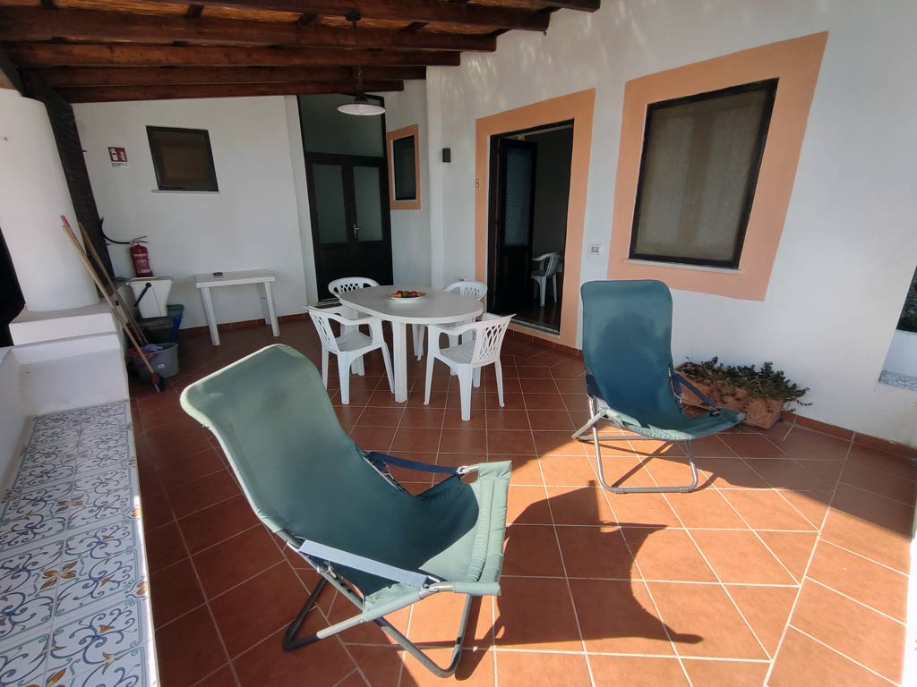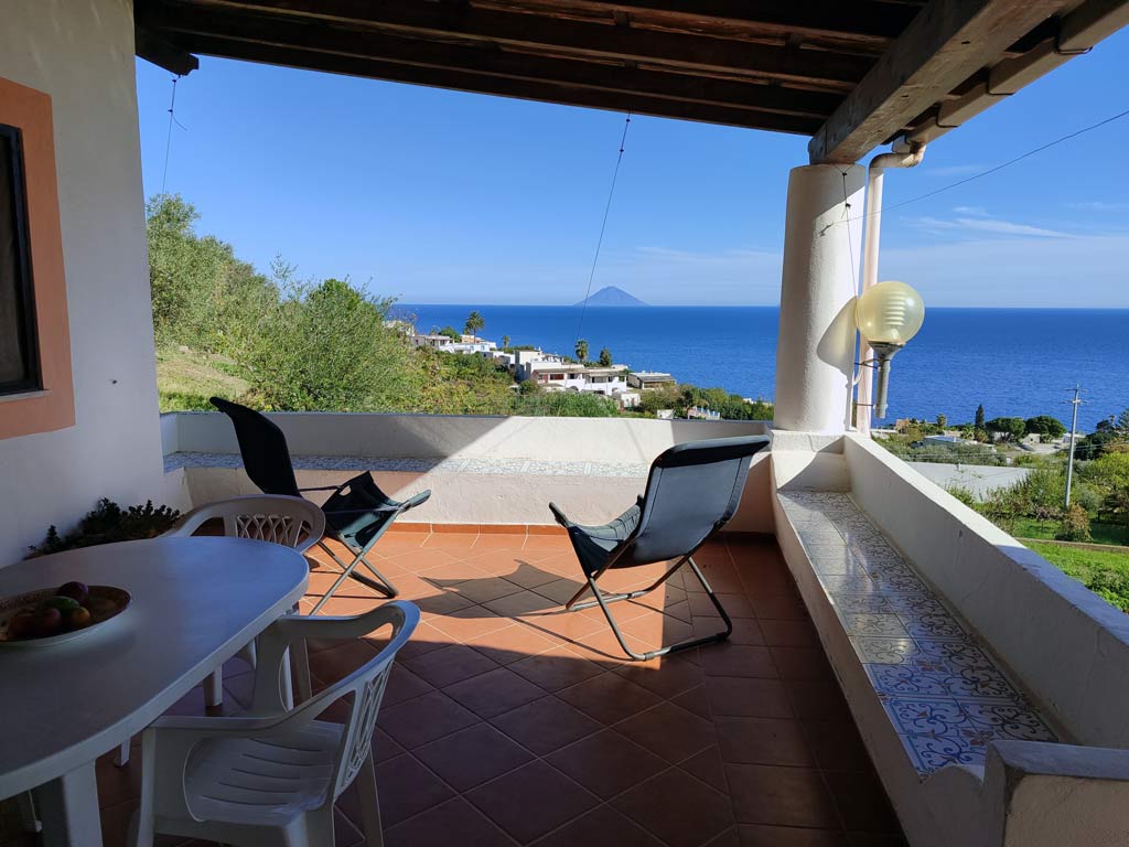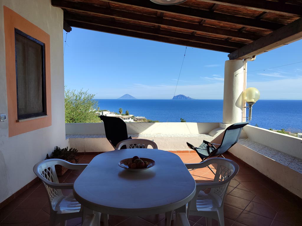 This apartment has the typical Aeolian terrace, it is covered and very scenic with views of the islands of Lipari, Panarea and Stromboli, with table, chairs, loungers.