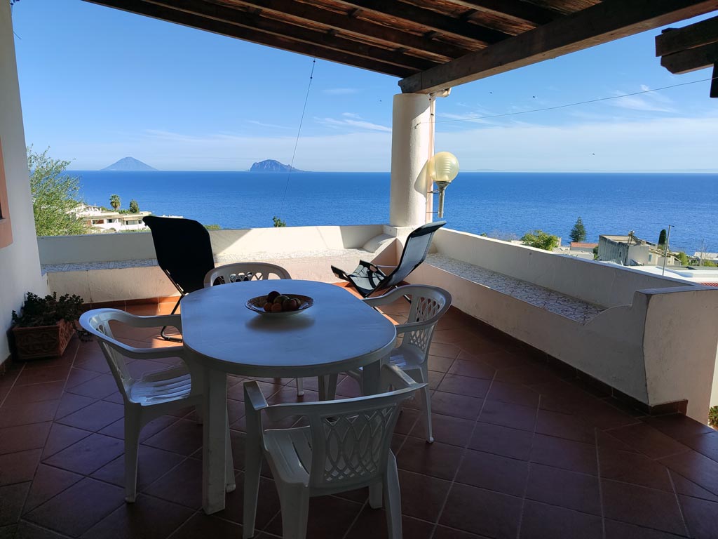 Questo appartamento ha terrazzo tipico eoliano con le sedute in muratura (bisuoli), è coperto e molto panoramico con vista sulle isole di Lipari, Panarea e Stromboli, ed attrezzato con tavolo, sedie, sdraio.