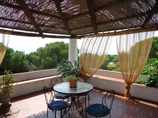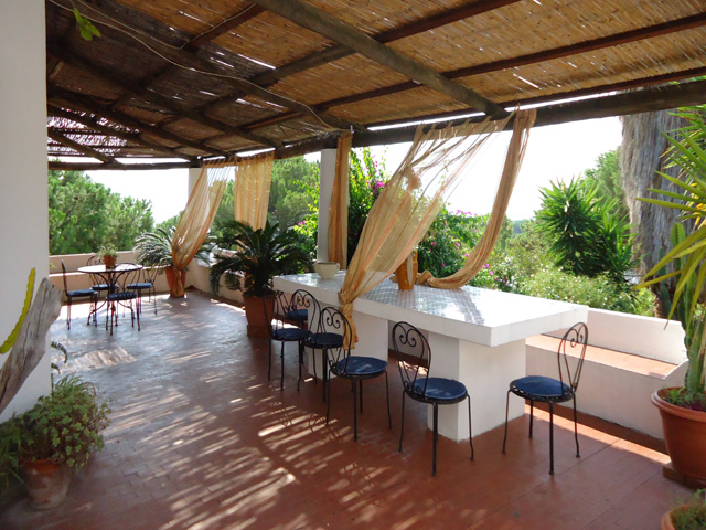 Il terrazzo della villa è coperto da incannucciato e molto ampio, arredato con mobili da giardino, con angolo lettura e un grande tavolo stile eoliano in muratura ; tutto intorno un grande giardino con piante mediterranee molto curato.