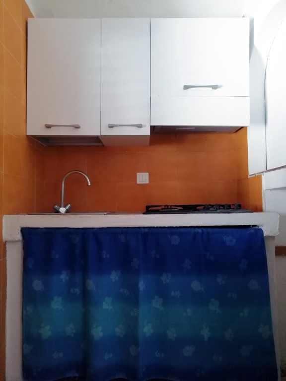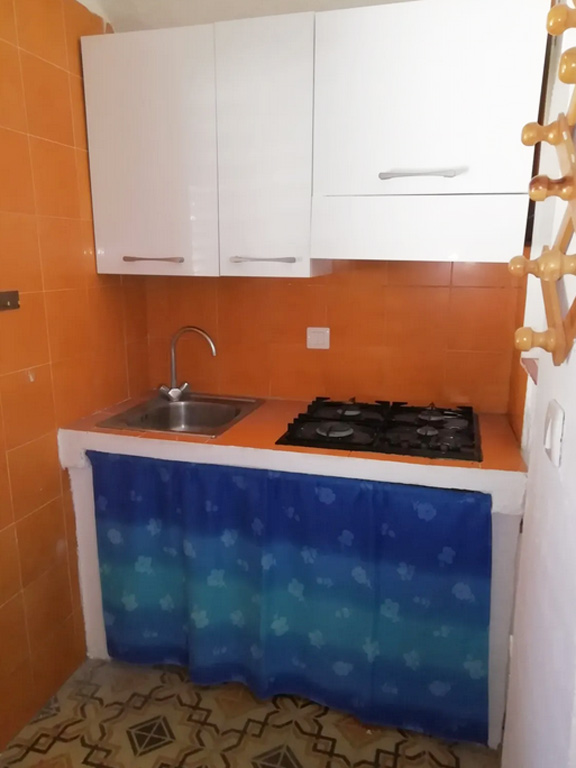 È un piccolo bilocale al pian terreno composto da camera da letto matrimoniale, zona ingresso-soggiorno con piccolo angolo cottura con piano 4 fuochi, tavolo e sedie. C'è anche aria condizionata.