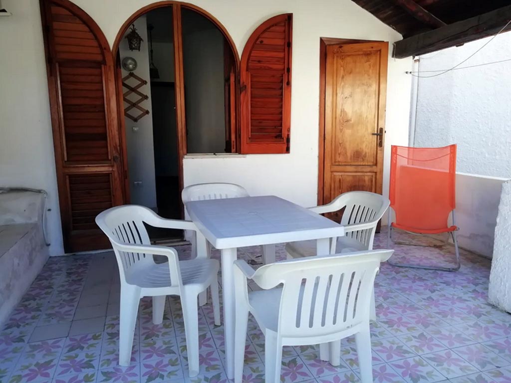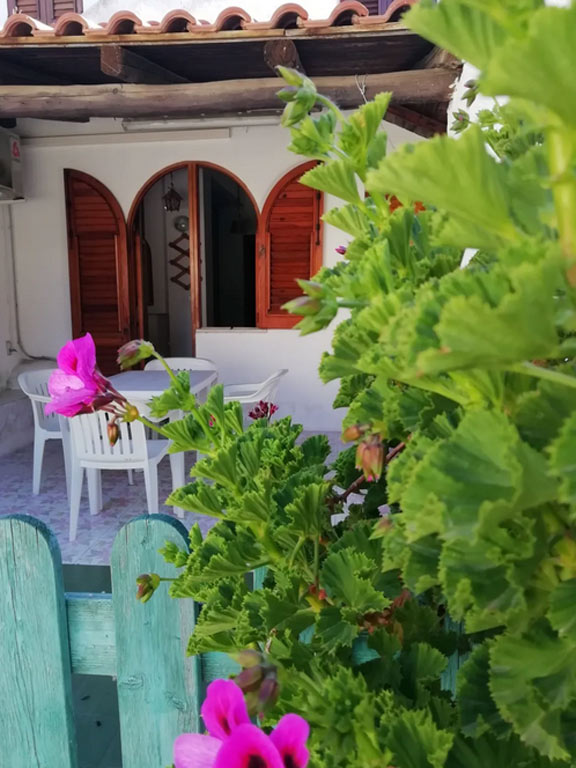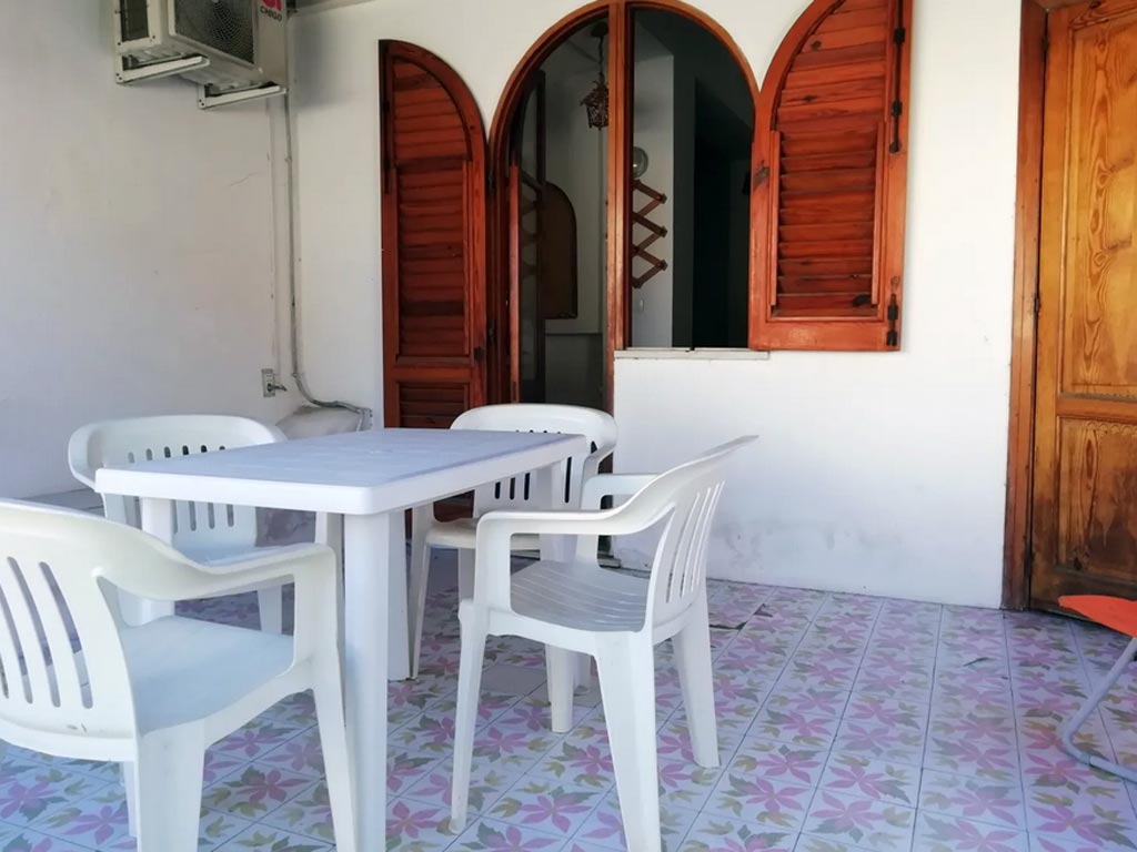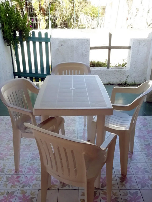 L'appartamento dispone di un terrazzino coperto attrezzato con tavolo e sedie e piccolo giardino con doccia esterna.